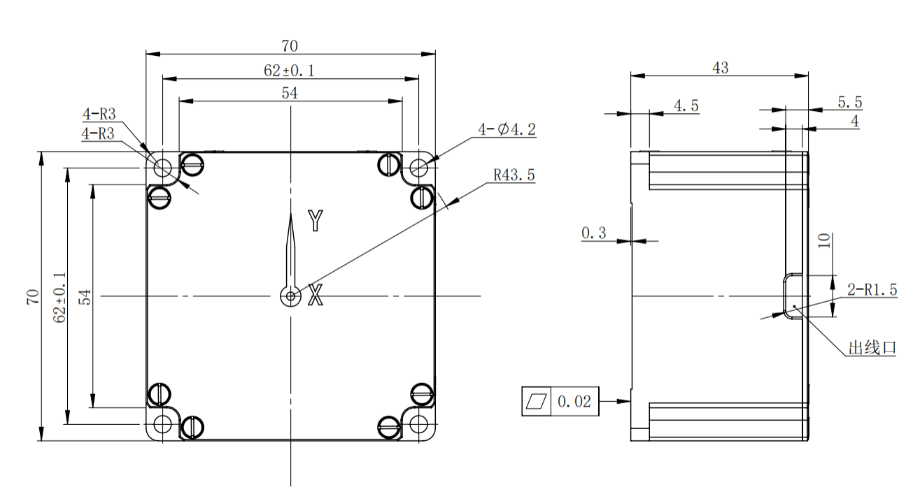 Dimensiones generales: 70 mm * 70 mm * 43 mm, tamaño de instalación: cuatro orificios 62 mm * 62 mm, tornillos de instalación: 4 tornillos M3, la forma y las dimensiones de instalación se muestran en la Figura 2.