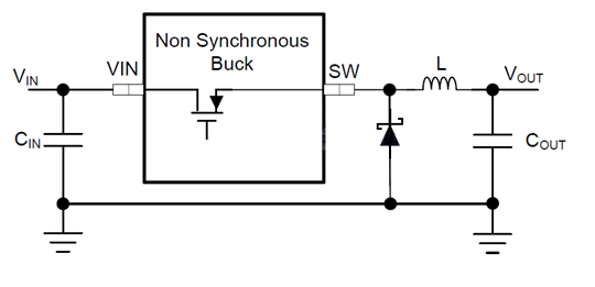 Figure 1 shows the topology of an asynchronous BUCK converter. Asynchronous BUCK converter chips typically integrate only the high-side MOSFET internally. A freewheeling diode needs to be installed between the SW pin and GND as the freewheeling path for the power inductor when the high-side MOSFET is turned off.