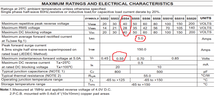 Figure 2 Electrical parameters of SS54 Schottky diode