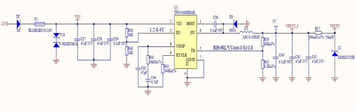 When the input voltage is a typical 12V, the duty cycle is a typical 5/12, and the average current flowing through the freewheeling diode is 5.0A*(1-5/12)=2.917A. When the input voltage is the maximum value of 36V, the duty cycle is a minimum of 5/36, and the maximum average current flowing through the freewheeling diode is 5.0A*(1-5/36)=4.3A. As shown in Figure 3, D3 (SS54) in the TPS54360DDAR circuit design example is the selected freewheeling diode.