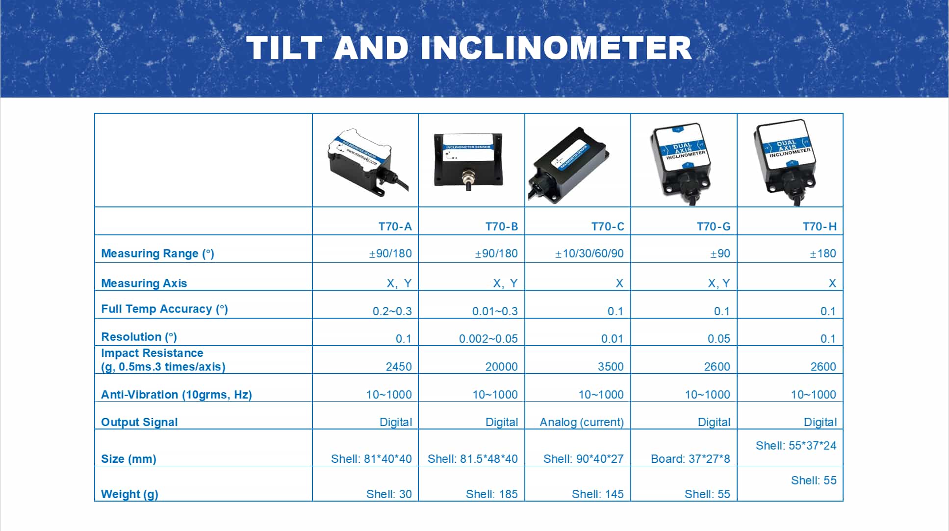 El T70-H es un sensor de inclinación digital de doble eje Fabricado por Micro-Magic Inc., empresa de alta tecnología, integra protocolos RTU Modbus y hexadecimales 0x68 estándar industriales; salida RS232, RS485, RS422, TTL opcional. Dirigido principalmente a mercados con altas limitaciones de volumen, costo y tasa de localización. Gracias a su unidad de inclinación con proceso de producción microelectromecánica MEMS integrado, ofrece un volumen reducido, bajo consumo de energía, alta consistencia y estabilidad, gran resistencia a interferencias electromagnéticas externas y alta capacidad para soportar impactos y vibraciones. Su objetivo es fabricar equipos de producción nacional y superar las barreras tecnológicas mediante la investigación y el desarrollo independientes.